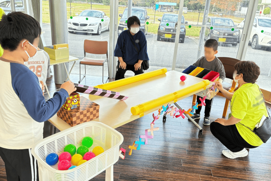 カラフルなボール転がしゲームでは、子どもたちが真剣な表情で挑戦し、ゴールに入るたびに歓声が上がっていました。