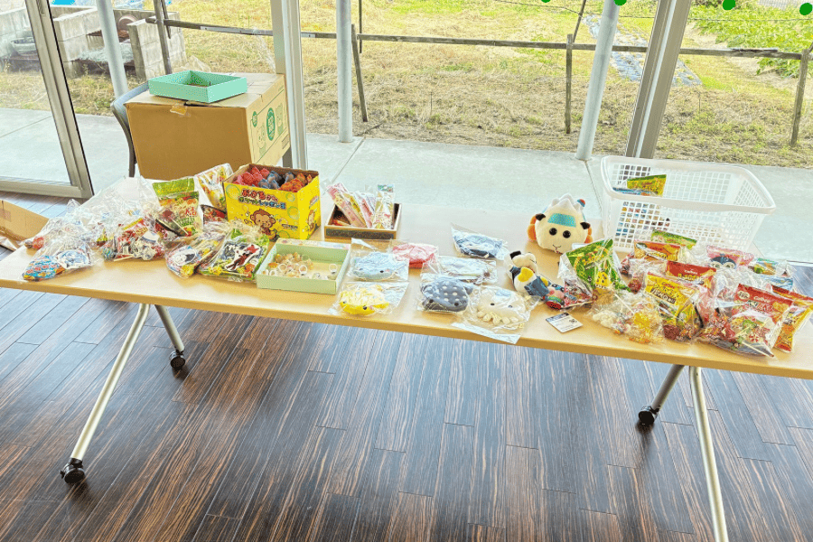 お菓子や小物、ぬいぐるみなどたくさん並んでおり、子どもたちはどれにしようか目を輝かせながら選んでいました。